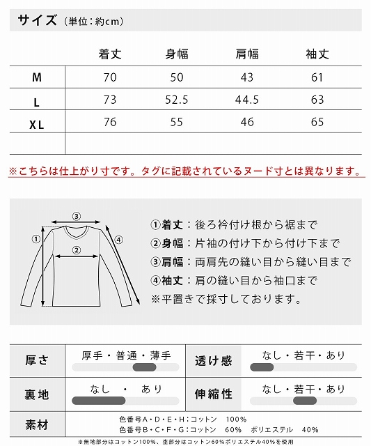 | (色番号B.C.F.G)綿60% ポリエステル40% |