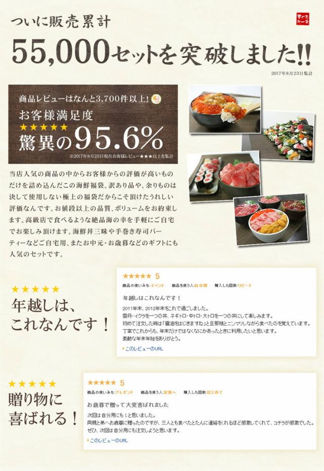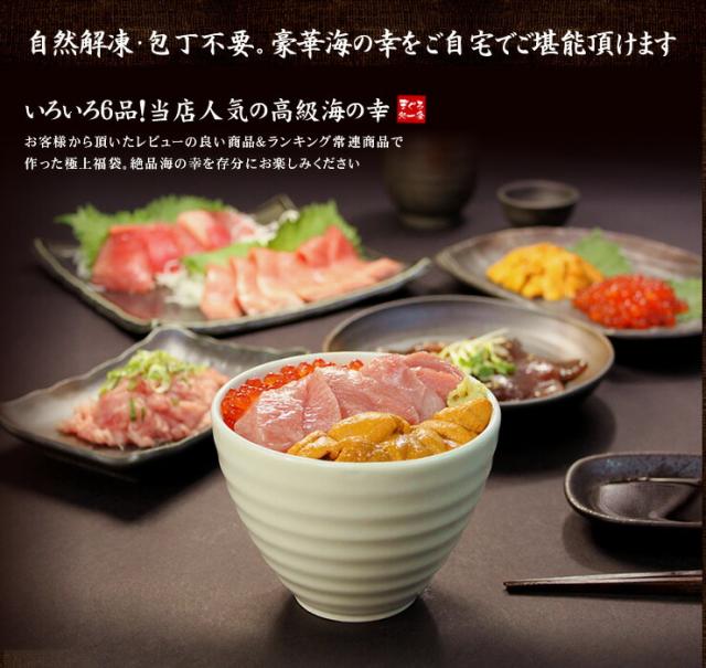 絶品海の幸いろいろ6品詰め合わせ、全品自然解凍OK! 55,000セット突破!4年連続グルメ大賞受賞の海鮮福袋。まぐろの王様「本マグロ」のカット済み大トロ100g、メバチ鮪中トロ100g、無添加お刺身ウニ100g、イクラ醤油漬け70g、粗挽きネギトロ100g、マグロづけ110g、色々6品、豪華海の幸が一度に楽しめる♪しかもうれしい全品自然解凍対応!包丁まな板不要で贅沢海の幸をご堪能いただけます。 |