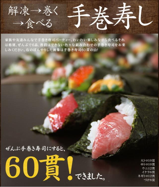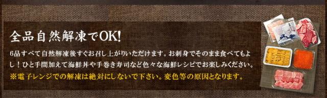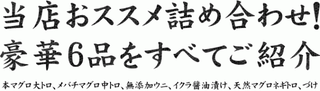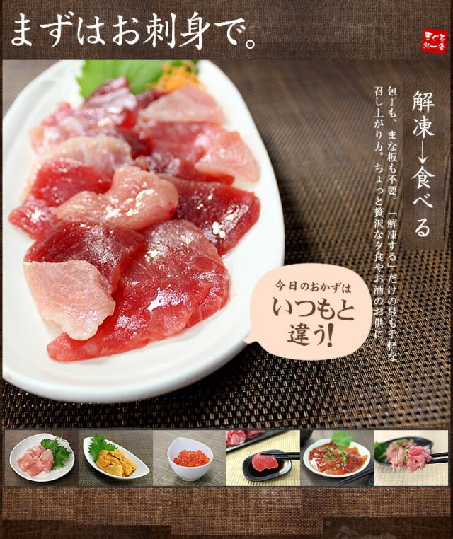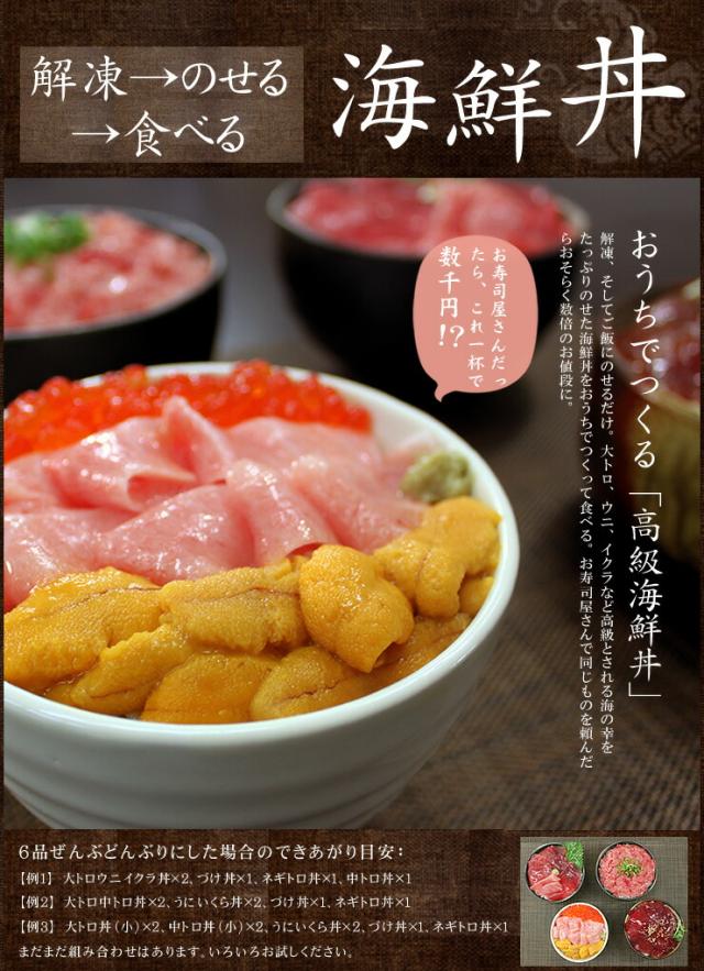 | 内容量 | 本マグロ大トロ100g、メバチ鮪中トロ100g、無添加ウニ100g、イクラ醤油漬け70g、ネギトロ100g、づけ110g(タレ込) | |||