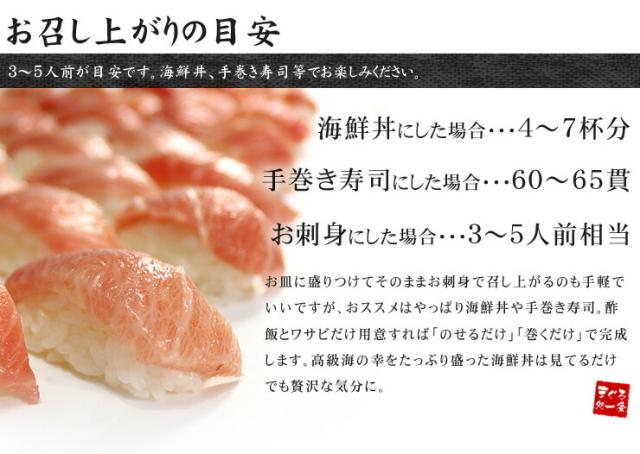 | 注意事項 | ●商品は冷凍状態で発送致します。 ●冷凍マグロの賞味期限は家庭用の冷凍庫の場合、約1週間程度となりますのでご注意ください。 |