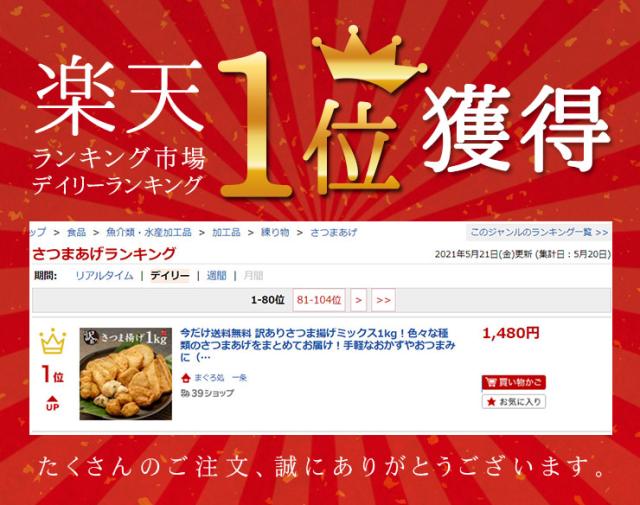 数種類のさつま揚げをまとめて1kgに詰め込みました!形の崩れてしまったもの・冷凍で欠けてしまったものが入る「訳あり品」。食べたい時に電子レンジで温めるだけの簡単調理。必要な分だけ取り出せて便利。おかずに、おつまみに、おやつにすぐ使えるスグレモノ。使い勝手抜群の冷凍さつま揚げです。 |