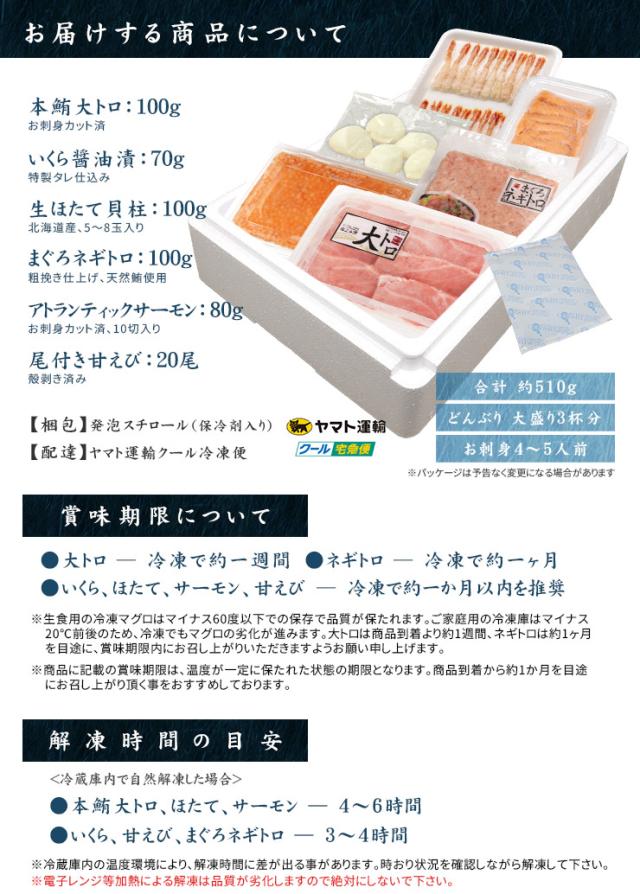 本鮪大トロ100g、いくら醤油漬け70g、北海道産生ほたて貝柱100g(5~8玉)、お刺身サーモン80g(10切入)、天然マグロネギトロ100g、尾付き剥き甘えび20尾