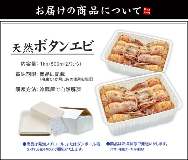 ぷりっぷり、甘みたっぷりの天然ボタンエビ1kg! 獲れたてを船上で急速冷凍した鮮度抜群の品です。お刺身でお召し上がりください。
