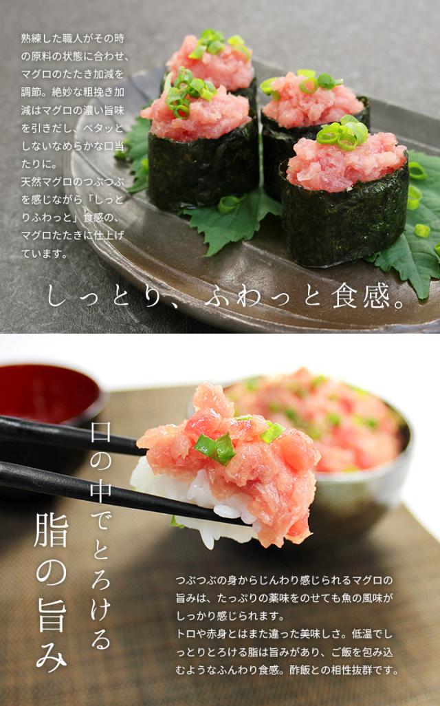 天然マグロのみ使用したネギトロ用たたき。天然マグロの絶妙な旨味がお口の中でまろやかに広がります。小さなお子様からお年寄りまで喜んでいただけます。当店の人気商品 |