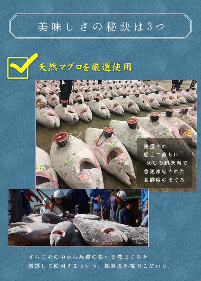 | 産地・原材料 | 鮪(黄肌鮪・目鉢鮪、びんちょう鮪、産地:日本・台湾・他)、植物油脂/pH調整剤、トレハロース、酸化防止剤(VC・VE) ※入荷状況により一部原材料が変更となる場合がございます。 |