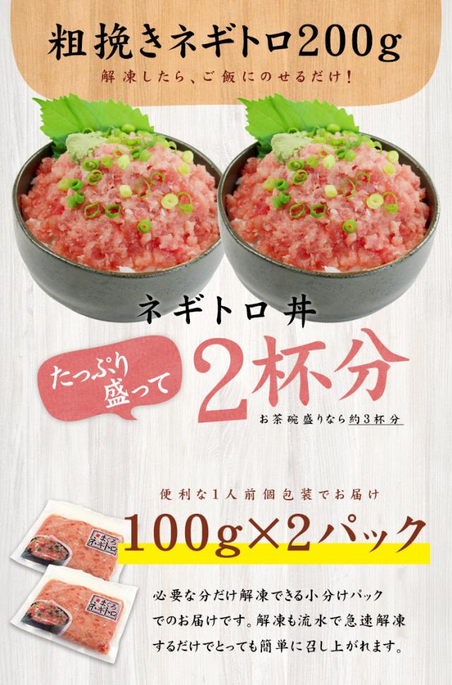 鮮度抜群の天然マグロのみ使用したネギトロ粗挽きタイプ100g×2パック!マグロのつぶつぶを感じながら「しっとり」とろける食感&味の濃いネギトロをご堪能下さい。しかも!2セット以上まとめ買いならどんどん増量します!