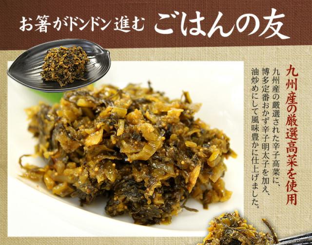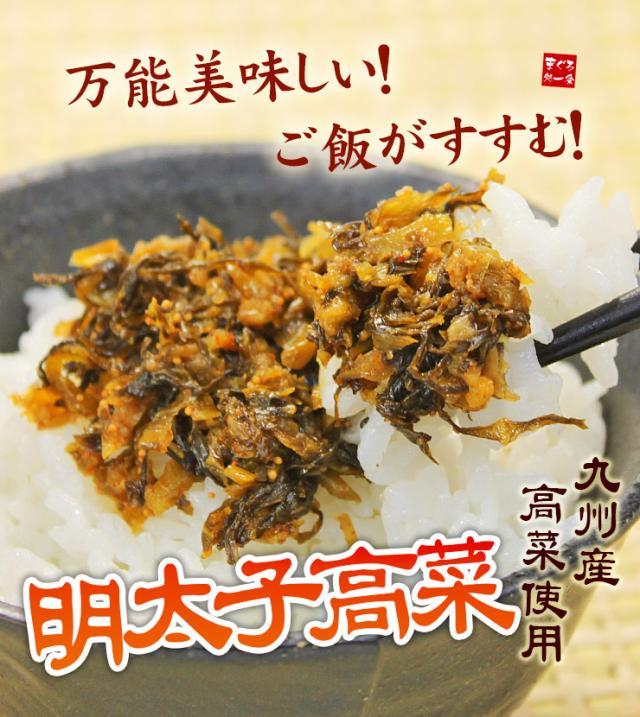| 原材料 | 高菜漬(高菜(九州産)、食塩、ウコン粉)、バラコめんたいこ、大豆油、糖類(砂糖、砂糖混合ぶどう糖果糖液糖、水あめ)、しょうゆ、発酵調味料、魚介エキス(かつお、いわし、さば、その他)、香辛料、醸造酢、たん白加水分解物、キムチ風調味料/調味料(アミノ酸等)、酸味料、甘味料(D-ソルビトール)、パプリカ色素、香辛料抽出物、(一部に小麦・大豆・さばを含む) |
