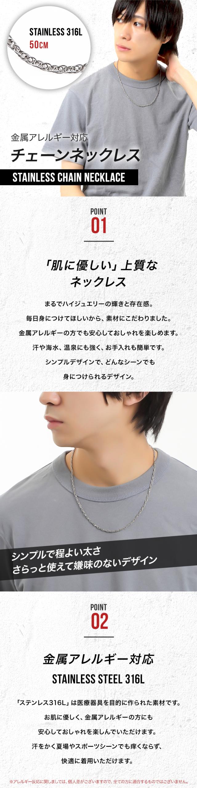 「 男女兼用 」で使用できる、ジュエリー感のある洗練された質感使いやすい定番の50cmサイズは人気のネックレス。程よい艶感のあるチェーンネックレスは、女性だけでなく、男性にもおすすめです。シンプルなデザインで、どんなスタイルにも◎重ね付けにしてレイヤードスタイルにしてもおすすめです。「 ステンレス 316L 」は金属アレルギー対応で、お肌に優しく安心です。