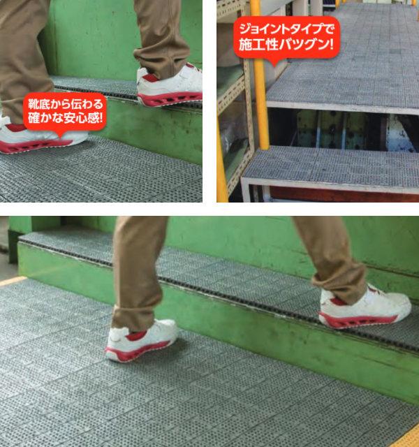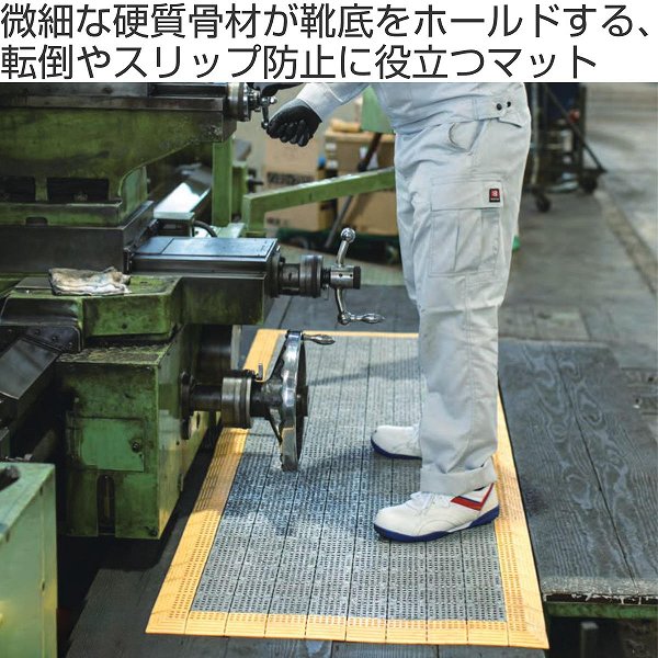 高いノンスリップ効果で、工場内の水や油による転倒・スリップ防止に役に立つジョイントマットです。スルー形状タイプでゴミがマットの上に溜まりません。