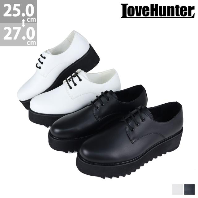 【返品交換不可】シューズ カジュアルシューズ メンズ レースアップ 外羽根 プレーントゥ 3ホール 厚底 シャークソール 脚長 防滑 おしゃれ 5.5cmヒール No.1712 25.0cm〜27.0cm 黒 ブラック LOVEHUNTER ラブハンター