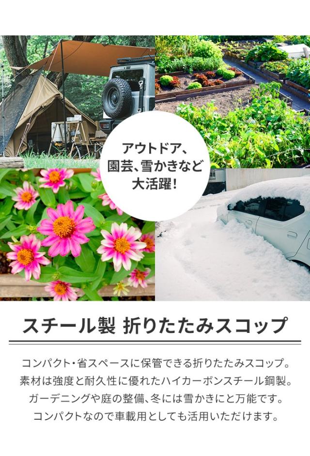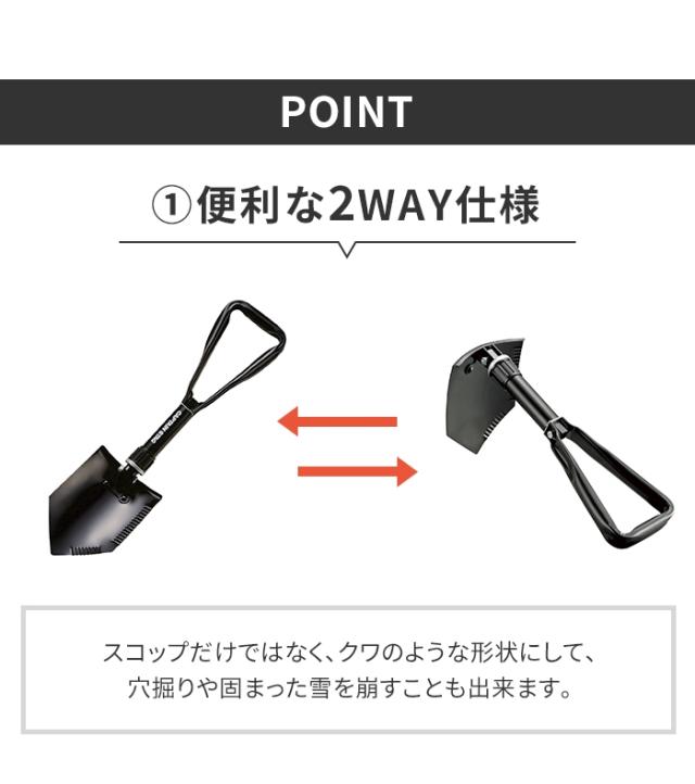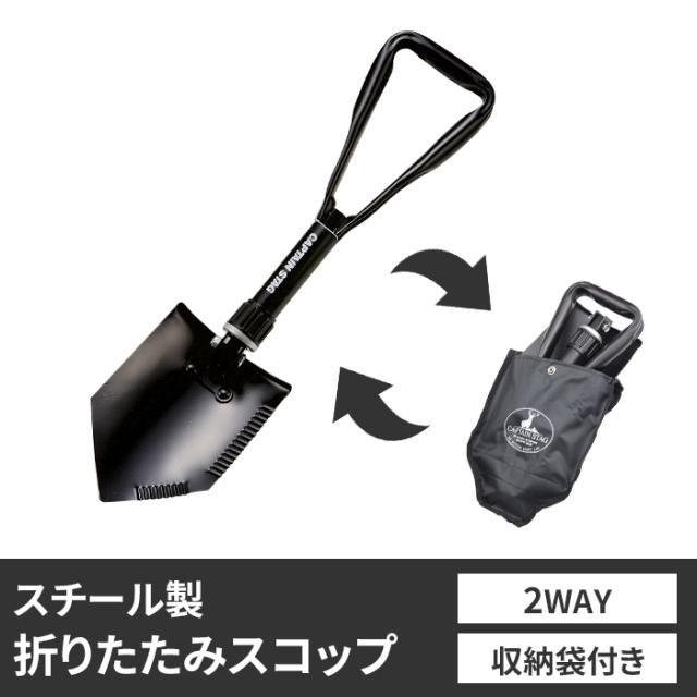 | 携帯用スコップです。 丈夫なハイカーボンスチール鋼を使用。 スコップ・クワの2通りの使用ができます。 持ち運びに便利な収納バッグ付きで、折りたたんでコンパクトに収納可能です。 |