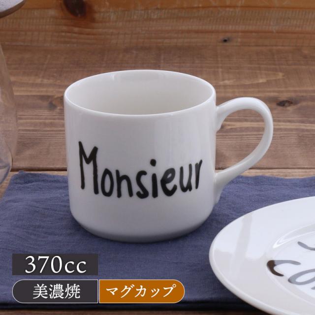手書き風文字のフランス語「Monsieur」(お客様)があしらわれた、おしゃれなマグカップ。