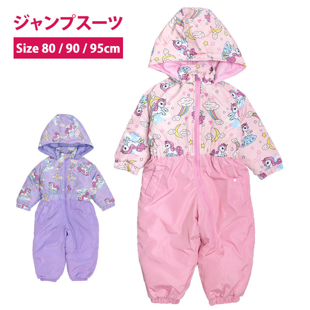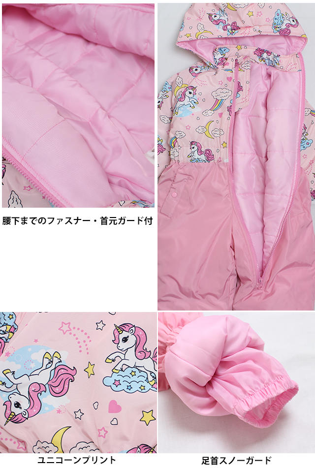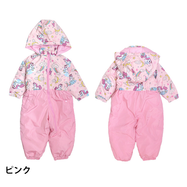 ベビー ジャンプスーツ 女の子 子供 ユニコーン柄 スノーウェア 雪遊び 中綿 カバーオール つなぎ 80cm 90cm 95cm