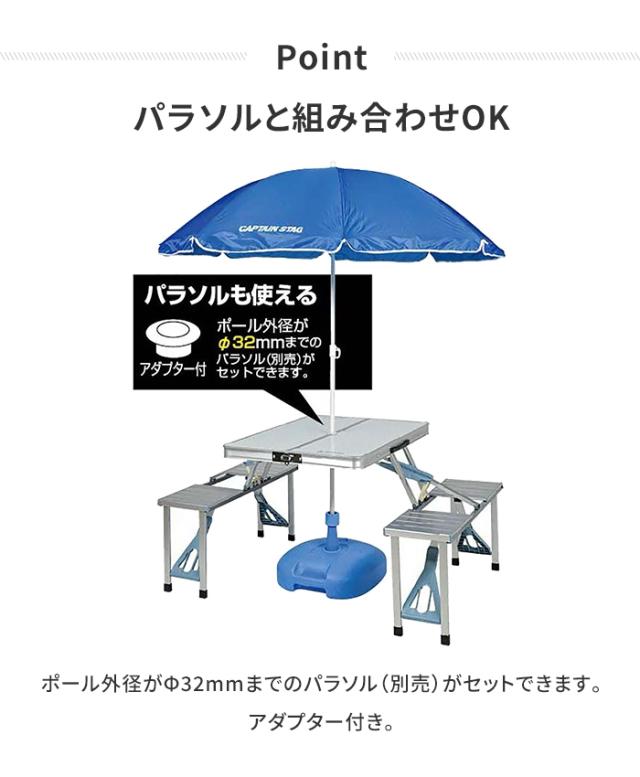 | チェアとテーブルが一体になったピクニックテーブル。 コンパクト収納。テーブルの中にチェアが収納でき、持ち運びに便利。持ち運びに便利な取っ手付。 ローテーブルとしても使用OK。 チェアをテーブルの中へ入れればローテーブルとしても使用できます。 パラソルも使える。ポール外径がΦ32mmまでのパラソル(別売)がセットできます。アダプター付。 |