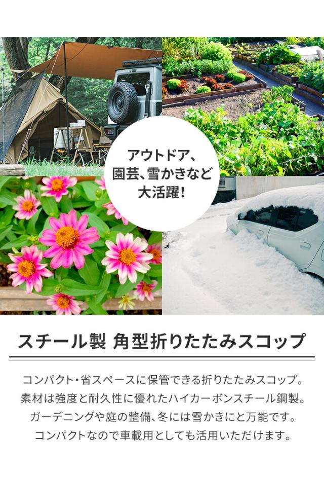 | 携帯用角型スコップです。 雪かき時にも便利です。 クワとしてもお使いいただけます。 強度・耐久性に優れたハイカーボン鋼製! 車載用に便利。 持ち運びに便利な収納バッグ付きで、折りたたんでコンパクトに収納可能です。 |