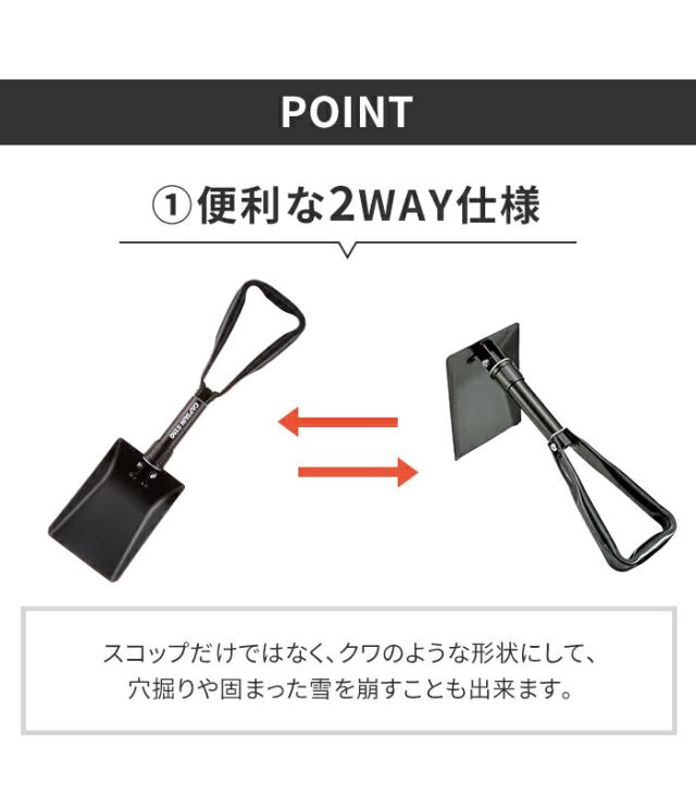 | ◇スコップ・クワと用途に合わせて2通りに使用可能。 ◇強度・耐久性に優れたハイカーボン鋼製。 ◇車載用に便利なコンパクトタイプ。 ◇雪かき時にも便利です。 ◇折りたたんでコンパクトに収納。 ◇収納バッグ付。収納バッグには、携帯に便利なベルトループ付。 |