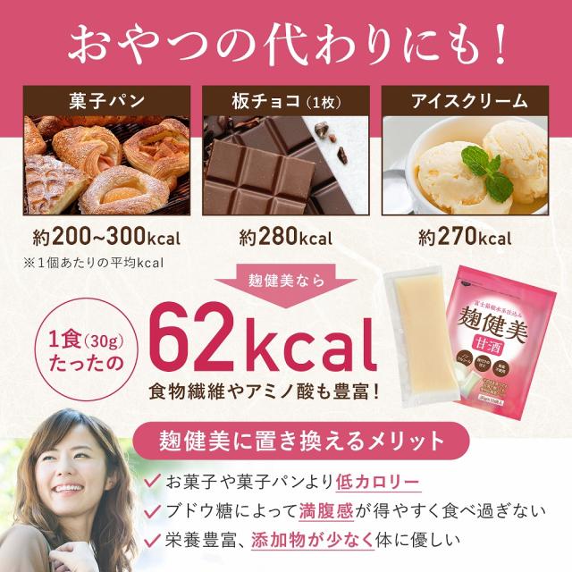 菓子パンやお菓子は高カロリーですが、麹健美なら1食(30g)たったの62kcal