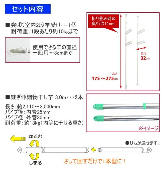 突っ張り室内2段竿受け・・・1個 継ぎ伸縮物干し竿 3m・・・2本 |