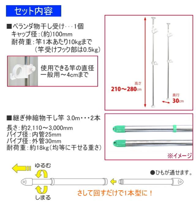 | セット内容 | ワンタッチベランダ物干し受け・・・1個 継ぎ伸縮物干し竿 3m・・・2本 |