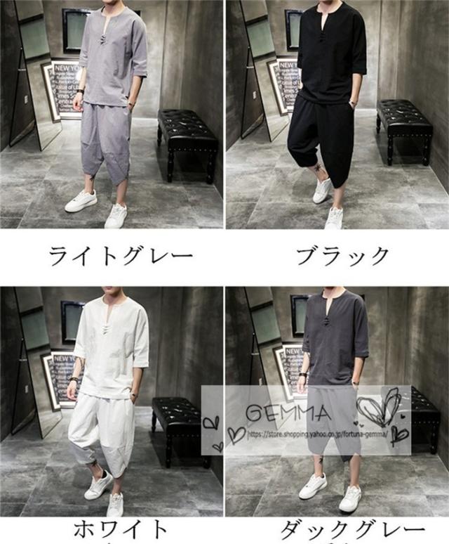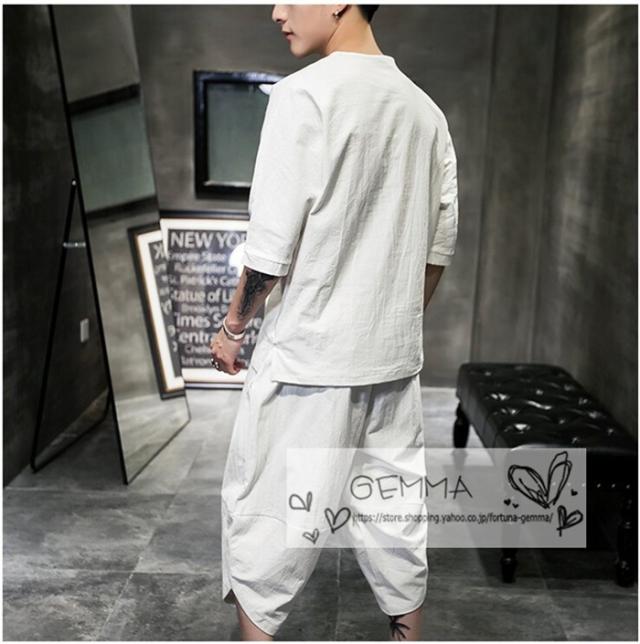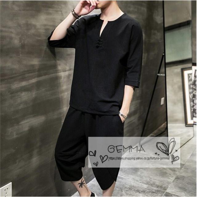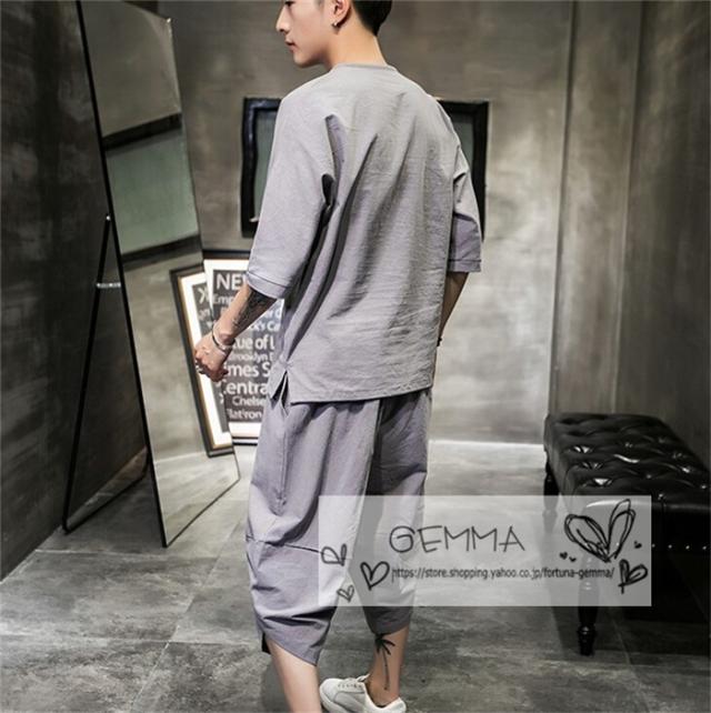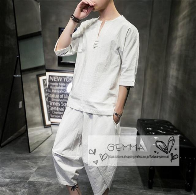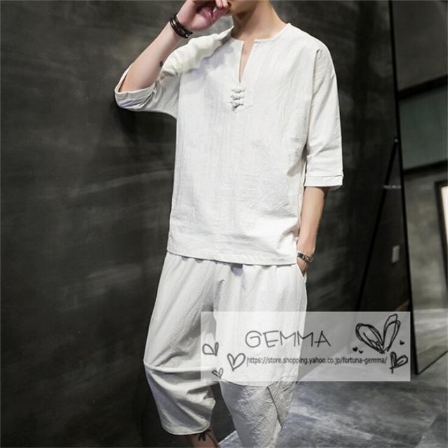 セットアップ メンズ 夏 リネン ジャージ 半袖 シャツ 上下セット スウェット 綿麻 部屋着 薄 男性 中国風 七分丈パンツ