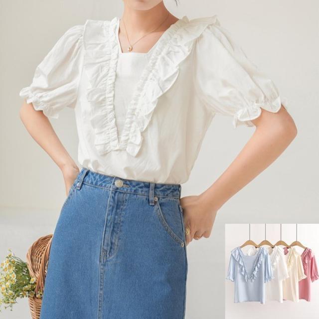 2021 春夏物新作 レディース トップス フリル ブラウス 大きなフリル コットンミックス 綿混 柔らか ソフト 涼感 涼しい 絞り袖 シャーリング ガーリー ピンク