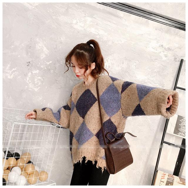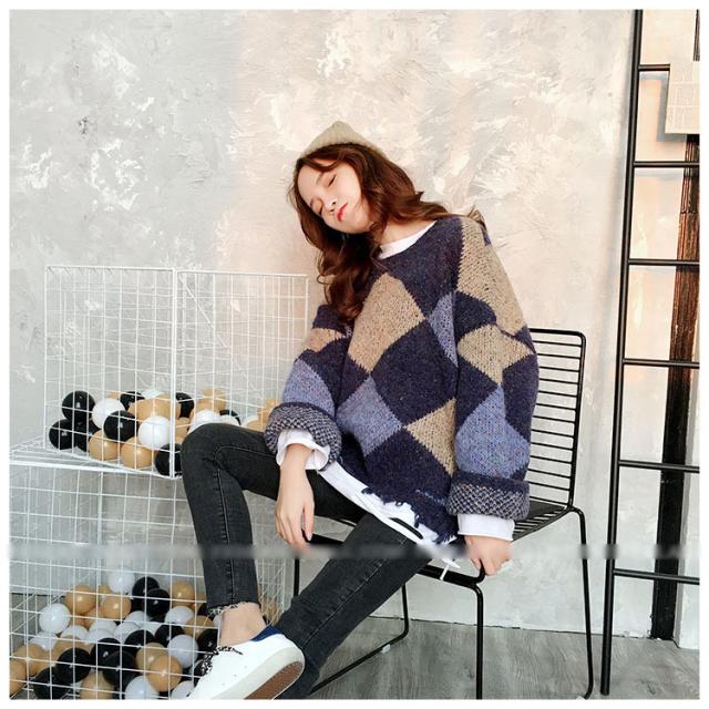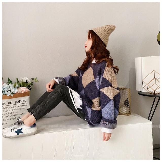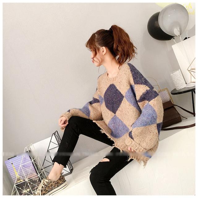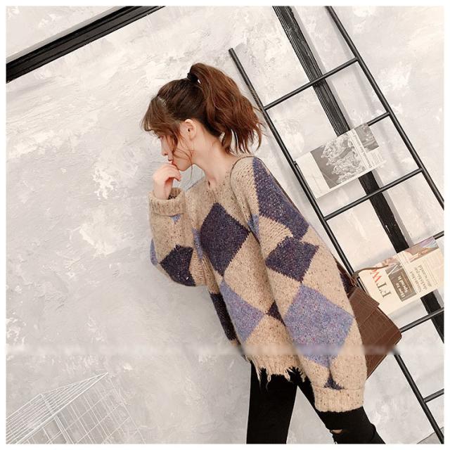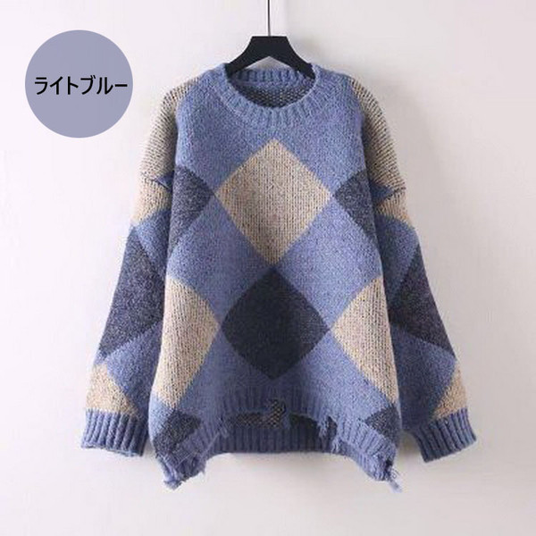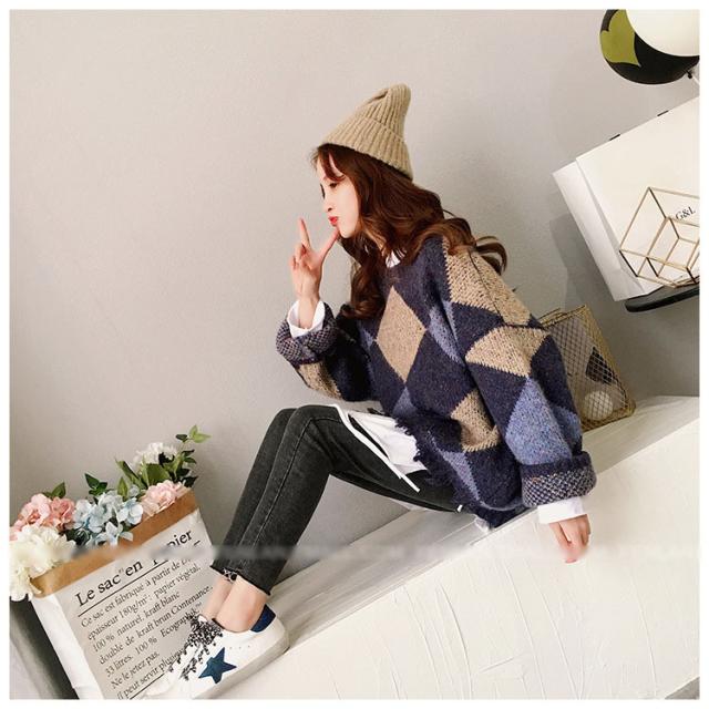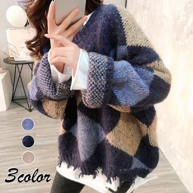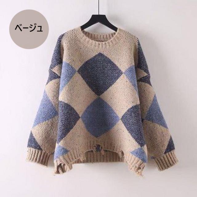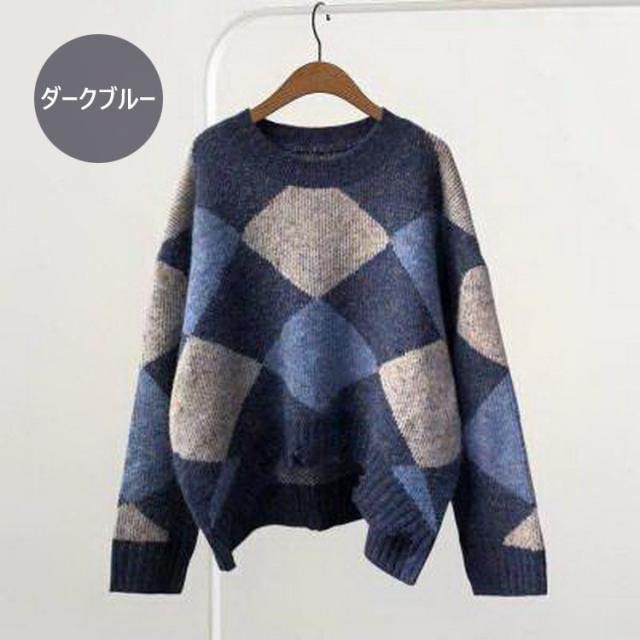 ニットトップス レディース 秋冬 長袖セーター 厚手 トップス ニットソー 幾何柄ニットセーター ショット丈 ゆったり 韓国風 大人可愛い オシャレカジュアル