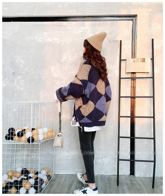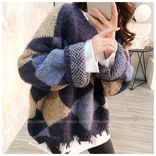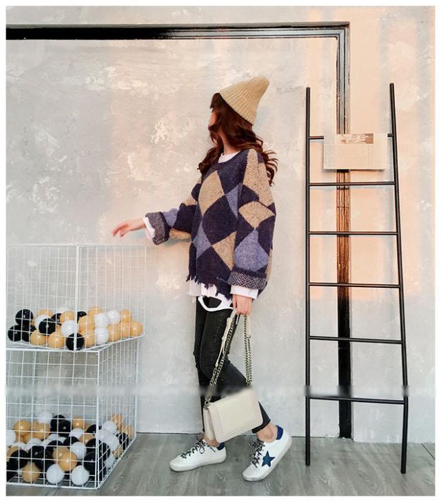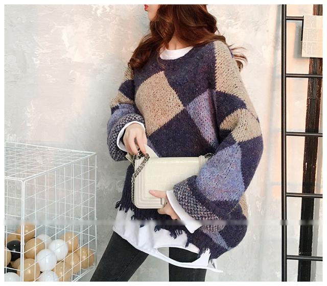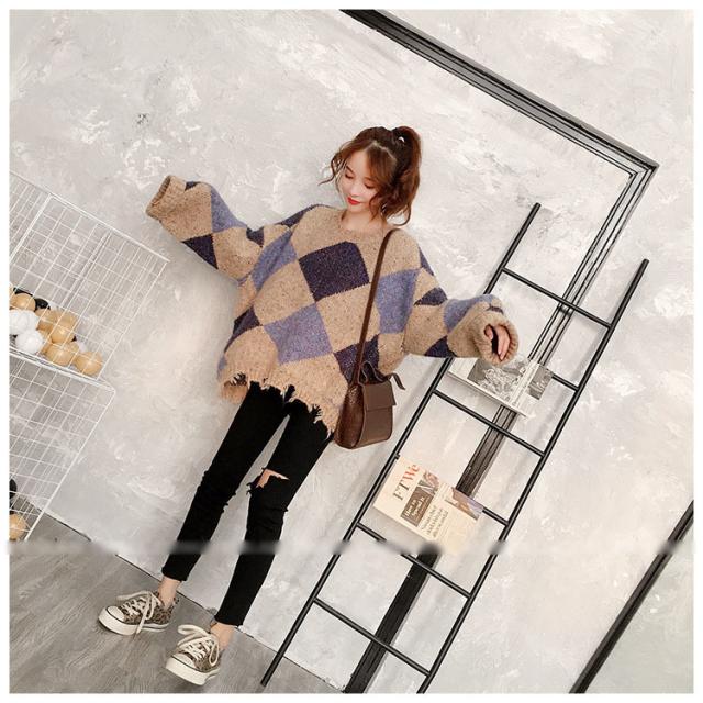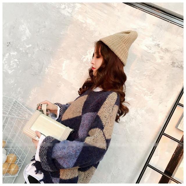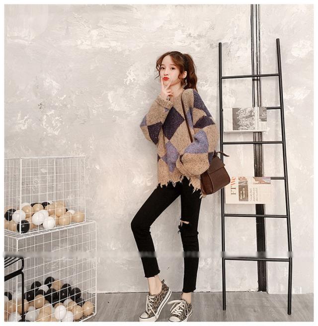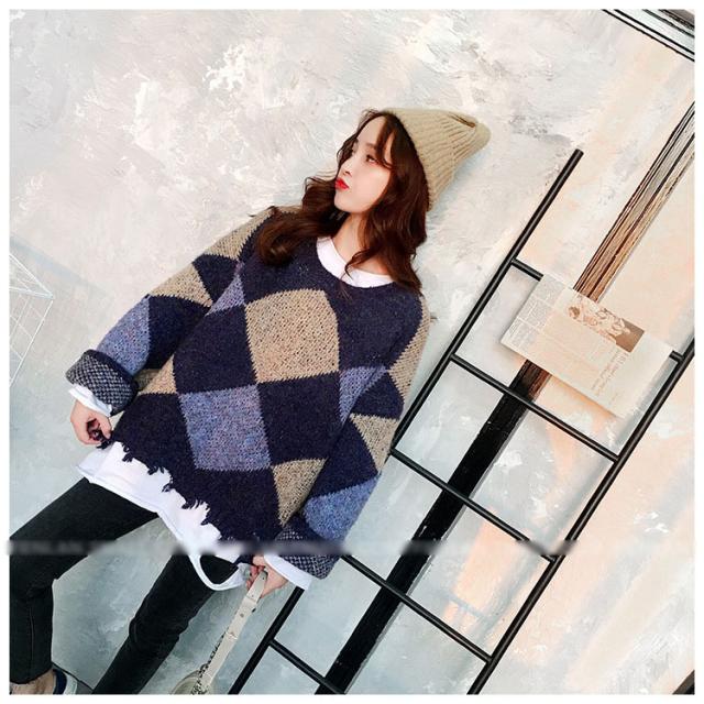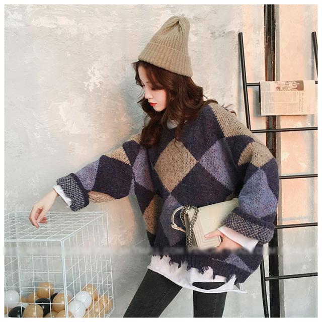 ニットトップス レディース 秋冬 長袖セーター 厚手 トップス ニットソー 幾何柄ニットセーター ショット丈 ゆったり 韓国風 大人可愛い オシャレカジュアル