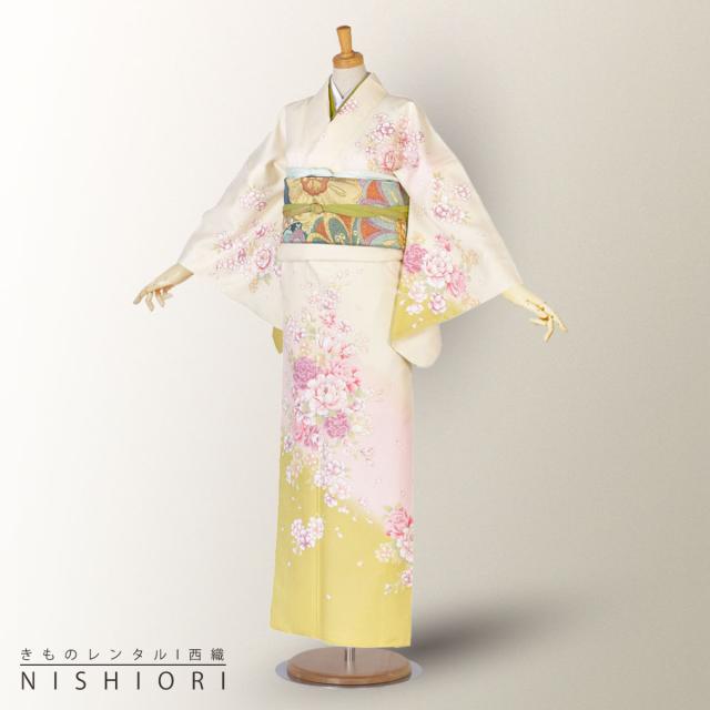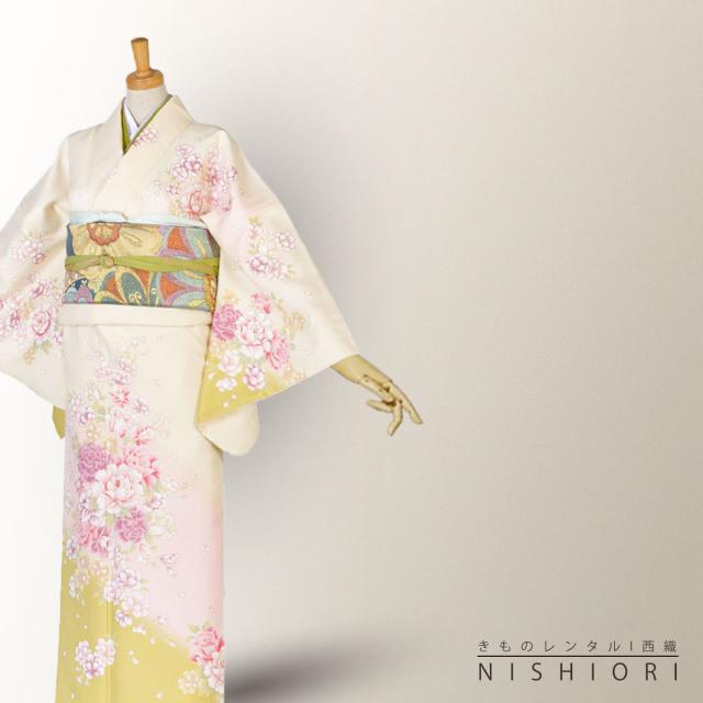 訪問着 レンタル 着物 貸衣装 フルセット クリーム 緑 牡丹 薔薇No.0125