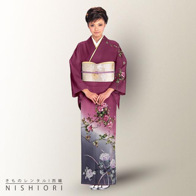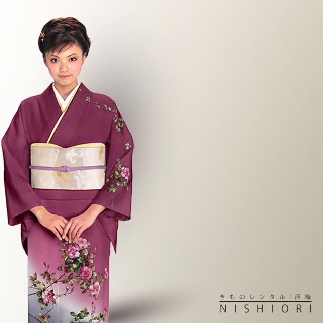 訪問着 レンタル 着物 貸衣装 フルセット えんじ 赤紫 椿No.0142