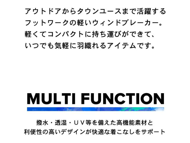 アウトドアからタウンユースまで気軽に使える高機能ウインドブレーカー。撥水や透湿、防花粉、UVカットを兼ね備えた高機能素材を使用しています。ポケッタブル仕様なので携帯に便利なのも嬉しいポイント。企業ユニフォームとしても人気のアイテムです。