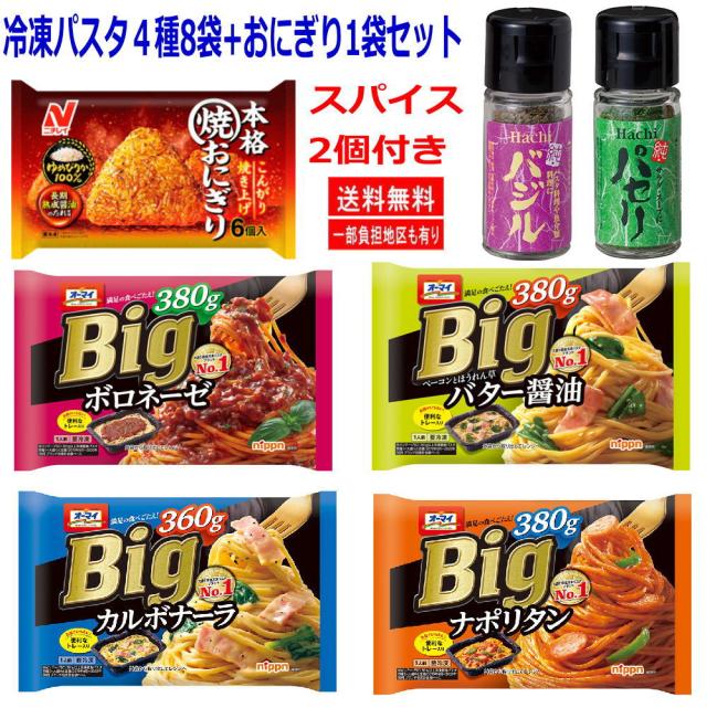 【新発売】 即食 時短食 ニップン オーマイ 冷凍スパゲッティ ビッグ360から380g 8袋と 焼きおにぎり 1袋の9袋セット スパイス付き 関東圏送料無料