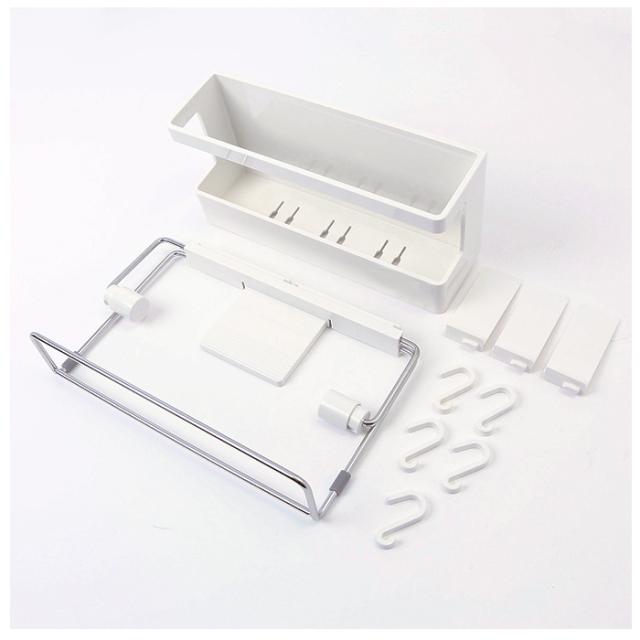 | 素材 | [本体、仕切り]ABS樹脂 [ペーパーホルダーユニット] ・ペーパースベリ止め部、エンドキャップ、フック:ABS樹脂 ・クッション:シリコーンゴム ・アーム、バネ:ステンレス鋼 [マグネット]ラバーマグネット |