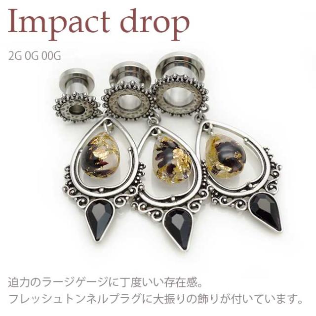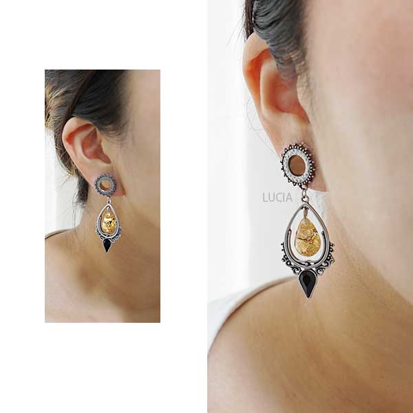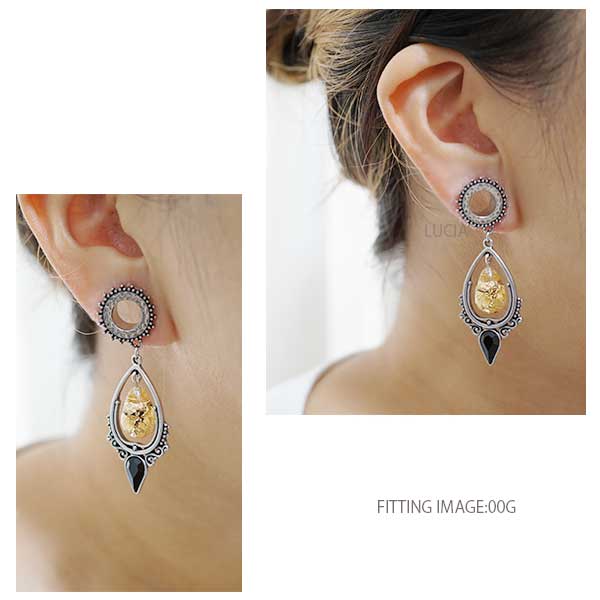 迫力のあるフレッシュトンネルに琥珀色のドロップ型のチャームが付いた迫力のプラグ系ピアスです。
