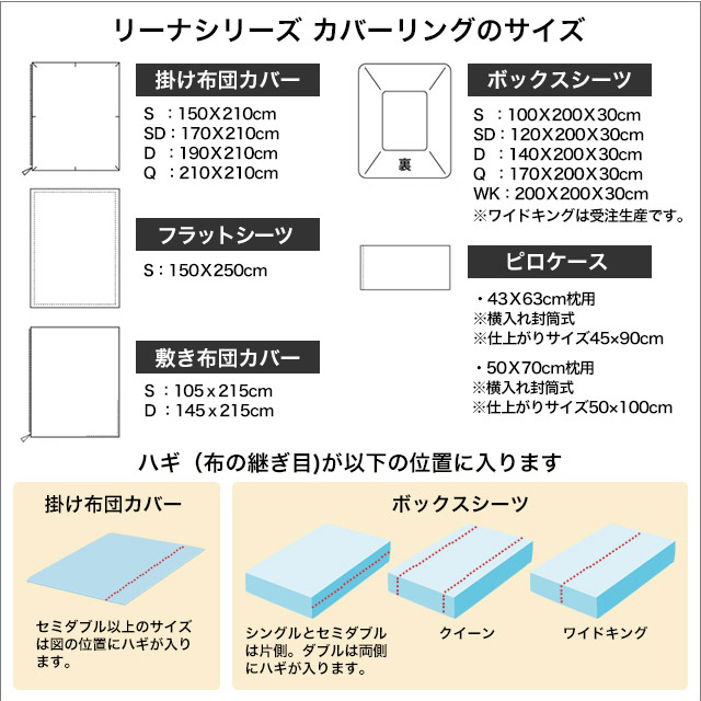 ・43X63cm 枕用 ※仕上がりサイズ:45X90cm 封筒式 ・ ※仕上がりサイズ:50X100cm 封筒式 |