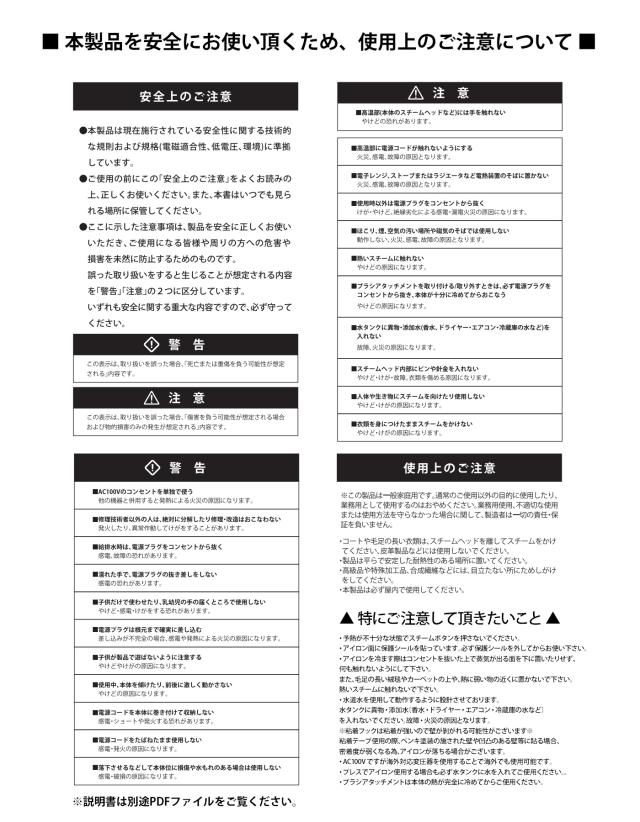 | ※サイズは目安にご参考下さいませ。 ※検品の際は、商品を取り出す為に一度開封致します。検品は細心の注意を払って行っておりますが、検査時に外箱などに開封痕が残る場合がございます。 ※生産・輸送の過程で慎重に取り扱いしておりますが、マットな風合いの加工をしている為、多少のキズがみられる見られる場合がございます。ご了承の上、お買い求めいただきますようお願い致します。 ドライアイロンとしての使用は出来かねます。 付属説明書にドライアイロンの記載がございますが、アイロン面(かけ面)自体が熱くなる仕様ではなく、スチームの熱でプレスが可能となっております。誠に申し訳ございませんが、予めご了承ください。 |