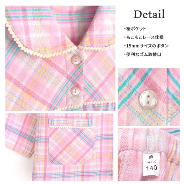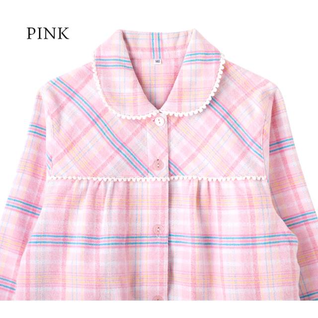 パジャマ キッズ 女の子 綿100% 長袖 冬 前開き ボタン 厚手のネル起毛 チェック柄 レース仕様 ピンク サックス 120 130 140 150 160 子供 ジュニア ガールズ おそろい