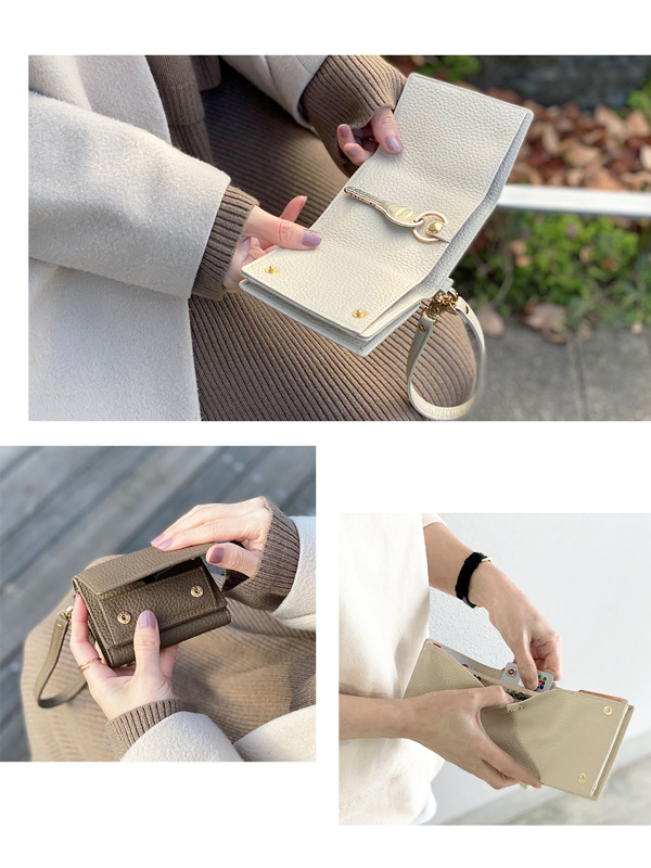 - 色はグレージュを購入しました。写真よりも少し落ち着いた色味です。小銭入れは使いやすく、スマートキーをリングに付けても問題なく三つ折りにできました。ストラップの金具が少し硬いので−1にさせて頂きましたが...