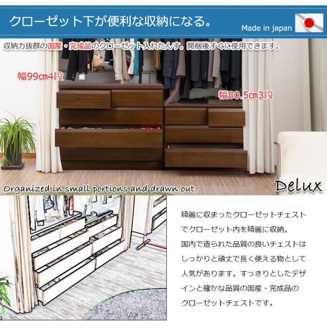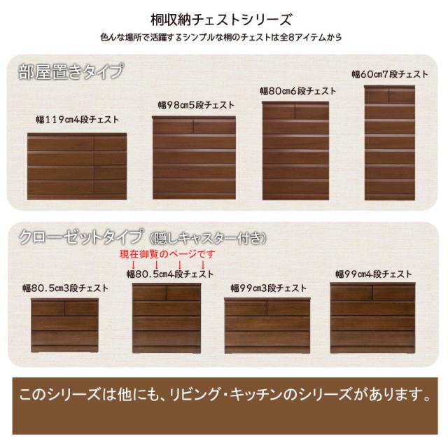 日本製 国産 クローゼットチェスト 幅80.5 4段 ダークブラウン チェスト 四段 クローゼット 収納 幅80.5cm 80.5cm幅 完成品 キャスター付き 北欧 木製 シンプル 天然木 桐 衣類収納 茶(代引不可)【送料無料】