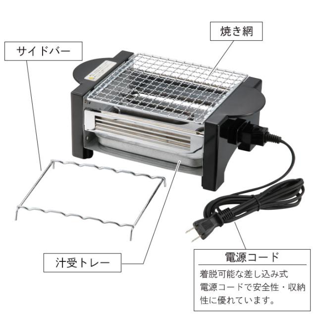 | [本体]フェノール樹脂、アルスター [焼き網]鉄、クロームメッキ [汁受けトレー]アルスター [サイドバー]鉄、クロームメッキ |