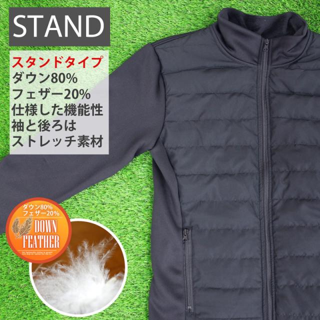 ダウンジャケットに袖と襟、後身頃にジャージ素材を切り替えたゴルフジャケット。
