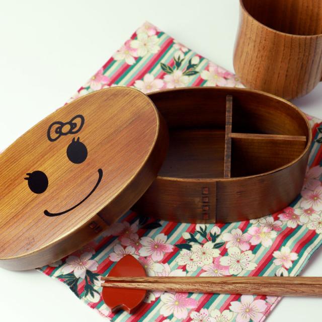 みよし漆器本舗オリジナルのお顔入り曲げわっぱ「まげワッパちゃん」。