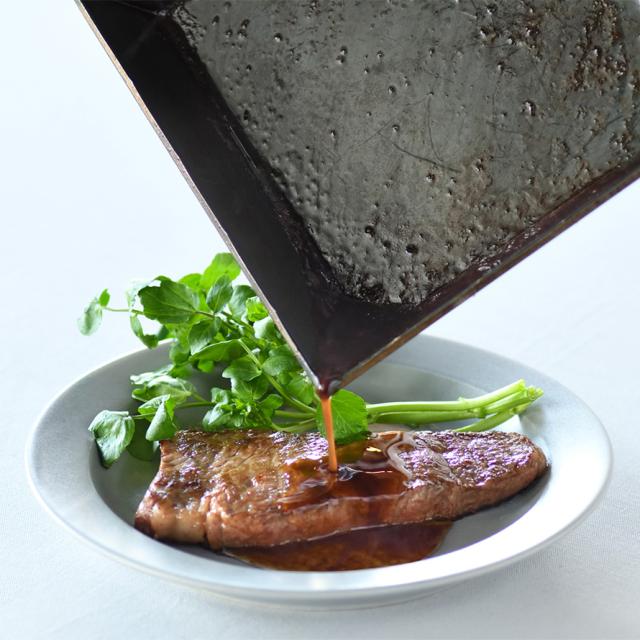 板厚3.2mmの厚い鉄板なので、食材にゆっくりと均一に熱が伝わり、厚切りステーキも上手に焼けます。