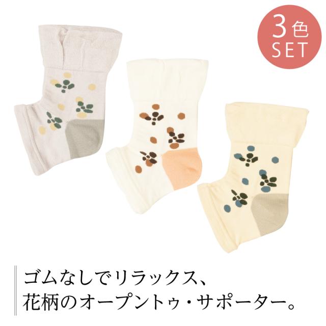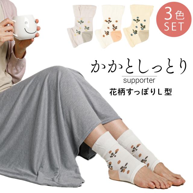 ゴムなしでリラックスできるかかと保湿の花柄サポーター3色組。かかと部分に保湿素材を使用しているので、しっとり。L型ヒール加工なので、足にすっぽりフィットしてずれにくい。