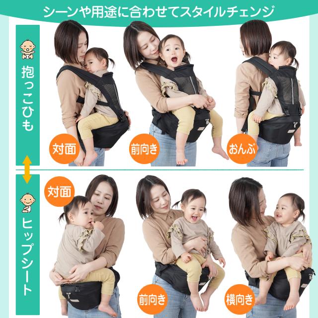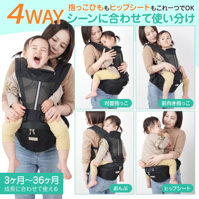赤ちゃんの体全体をしっかり覆って抱っこできる抱っこひもと、赤ちゃんを座らせて抱っこできるヒップシートの4WAY仕様。2ヶ所のバックルを外すと、抱っこひもとヒップシートが分離します。長時間抱っこする時は抱っこひもで、ベビーカーから抱き上げて少しの時間抱っこする時はヒップシートでなど、使い分けができます。