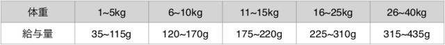 ・上記の表を目安に体重や便の状態、毛ヅヤなどを見ながら適宜調節して下さい。