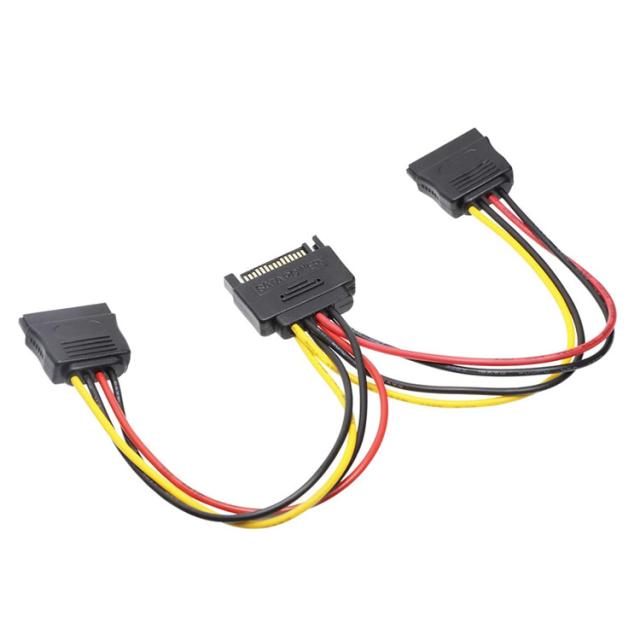 2つのSATA 15ピン(メス)コネクタと1つのSATA 15ピン(オス)コネクタを搭載したSATA電源分岐ケーブルにてパソコンの電源を二つのSATA HDD、SSD、光学式ドライブ、DVDバーナー、およびPIC-Eカードと接続できます。