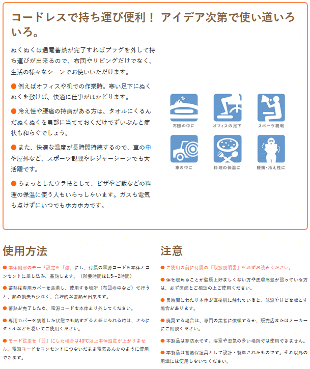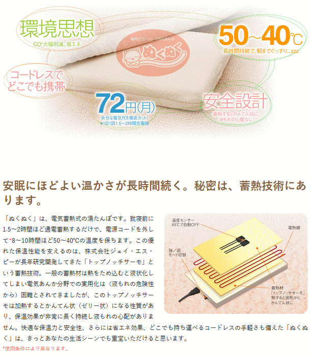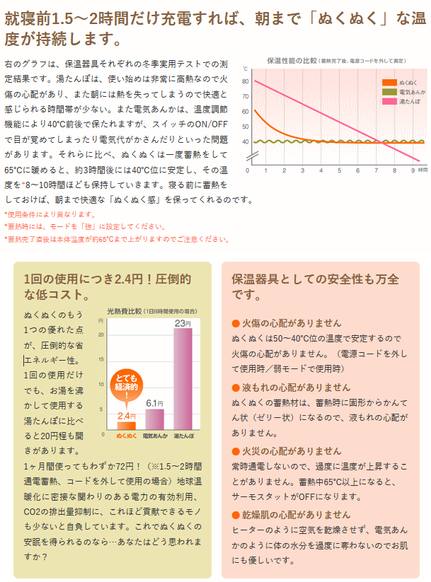 電気蓄熱式のあんかです。就寝前に1.5〜2時間ほど通電蓄熱するだけで電源コードを外しても8〜10時間は40℃〜50℃の温度を保ちます。保温効果が非常に長く持続し液漏れの心配も有りません。快適な保温力と安全性、更に省エネ効果、どこでも持ち運べるコードレスの手軽さも兼ね備えています。お湯を沸かす湯たんぽに比較して約20円程の低コスト。1ヶ月使用しても約72円程。ヒーターのように空気を乾燥させずお湯漏れの心配も無く、温度調整も可能で過度の水分も奪わないのでお肌にとてもやさしい設計がされています。
