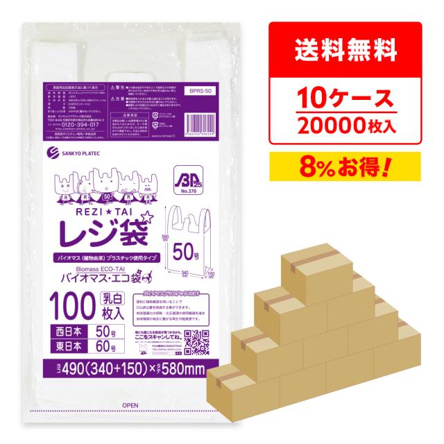 【まとめて10ケース】BPRS-50-10 バイオマスプラスチック使用レジ袋 西日本50号(東日本60号) 0.023mm厚 乳白 100枚x20冊x10箱 厚手タイプ ブロック有 送料無料