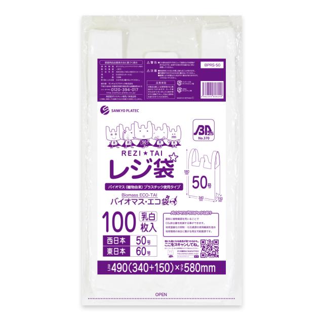 【バラ販売】BPRS-50bara バイオマスプラスチック使用レジ袋 西日本50号(東日本60号) 0.023mm厚 乳白 100枚 厚手タイプ ブロック有