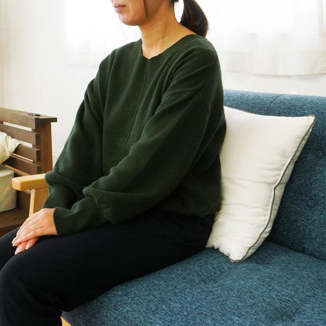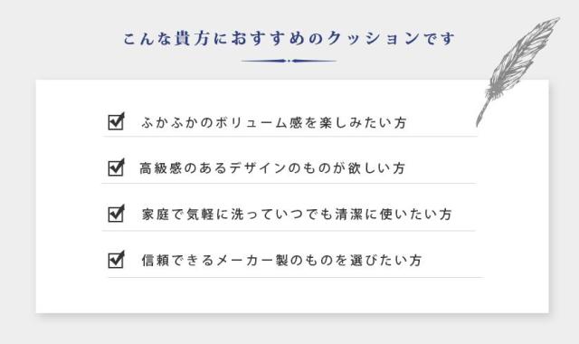 POINT.2 | ふかふかボリュームたっぷり! このボリュームが何ともいえない、クッションの高さはおよそ15cm。ふわっと包み込まれるリッチな量感で、至福のリラックスタイムに。一般的なクッションより重量感があり、へたりにくいので腰当てや枕など様々な用途でお使いいただけます。